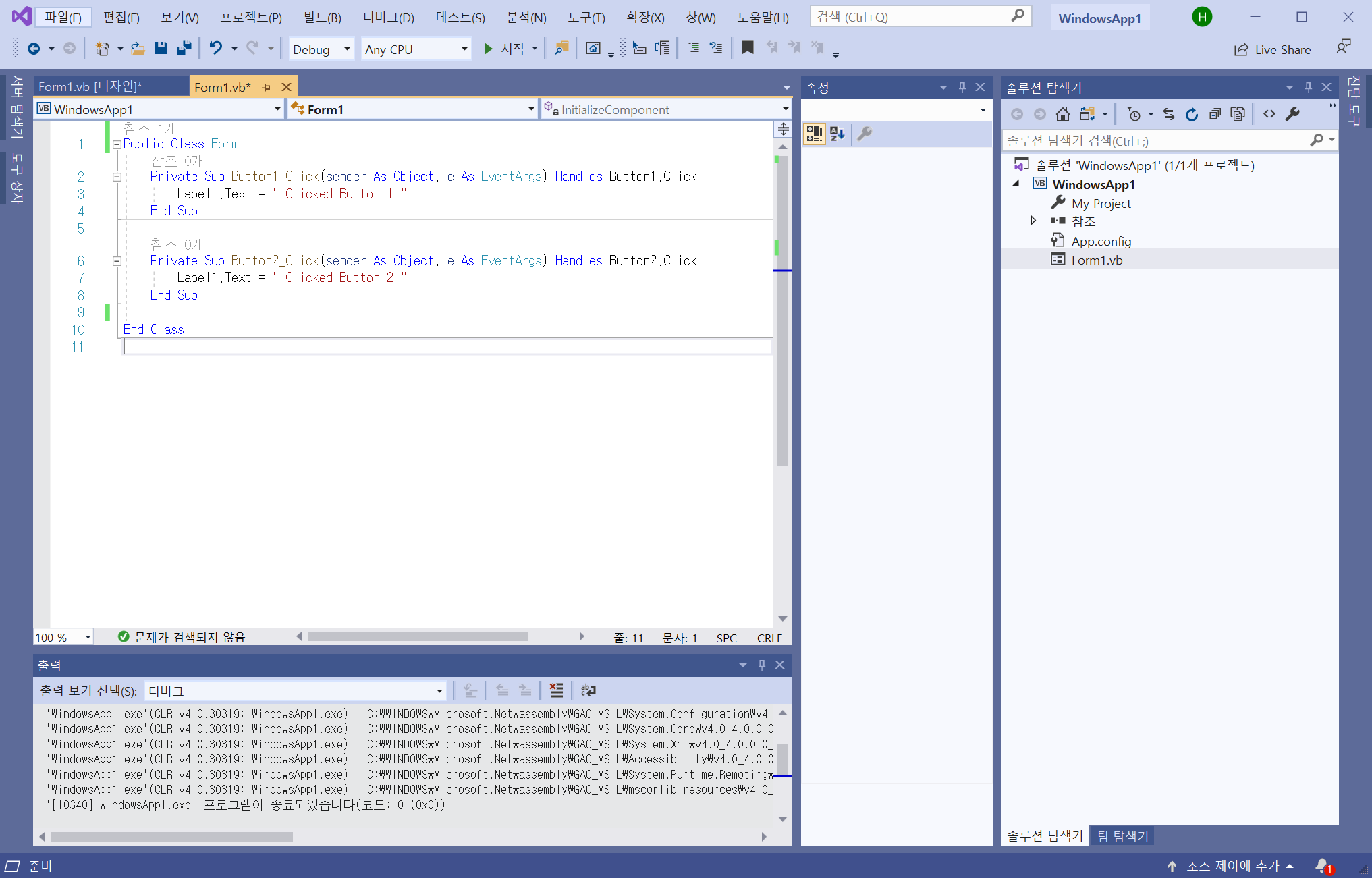 버튼 2을 클릭하면 Label1의 Text 속성을 => " Clicked Button 2 " 으로 변경하는 코드를 짜봤는데 잘 동작한다