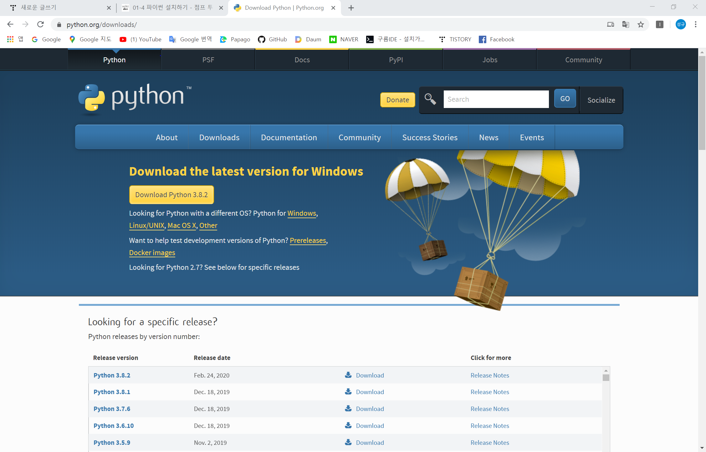 1. 파이썬 공식 사이트에서 원하는 버전 다운로드 클릭