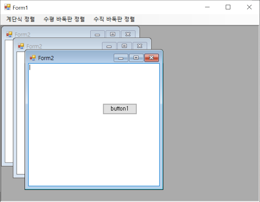 간단하게 만들어봤는데 Mdi 부모 폼에 있는 Button Control이 Child Form보다 상단에 위치하네??
