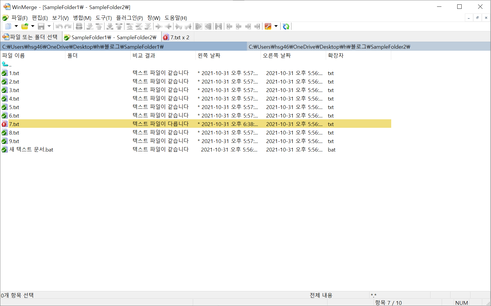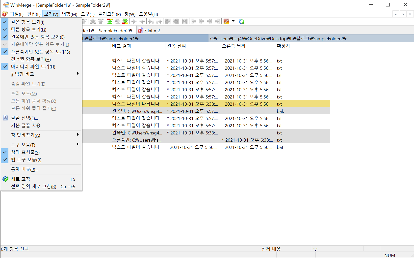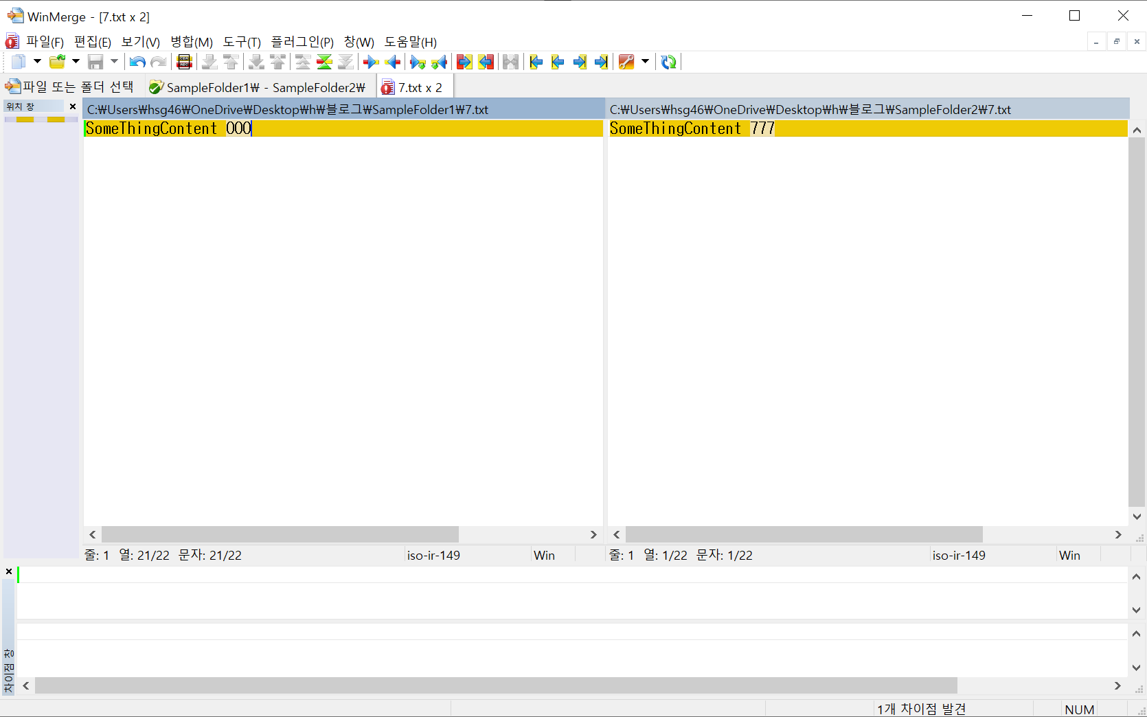 서로 교집합의 파일 내용 변경 뿐만이 아니라 SampleFolder1(왼쪽 경로) SampleFolder2(오른쪽 경로) 겹치지 않는 파일에 대한 내용도 한눈에 비교할 수 있도록 도와준다.