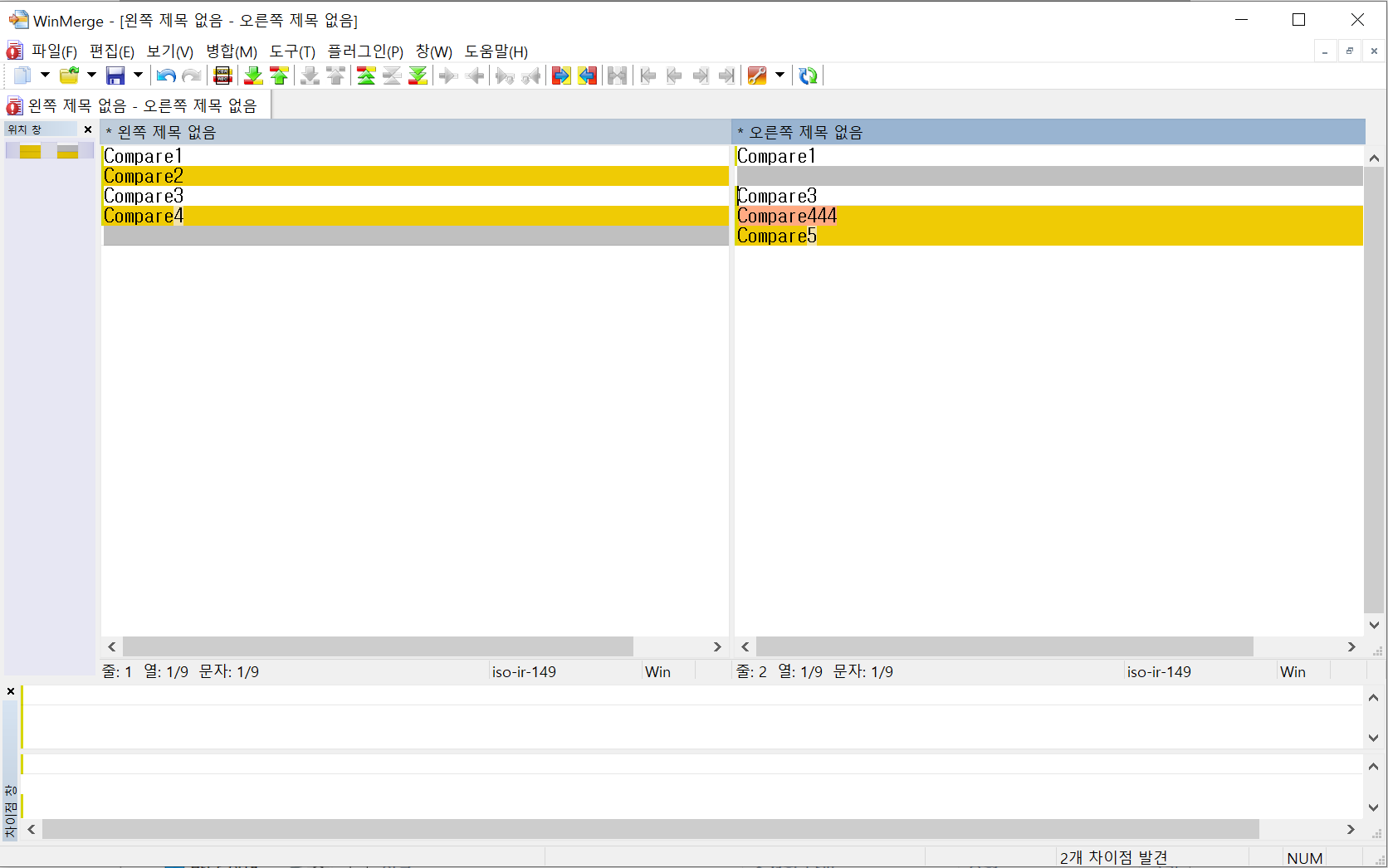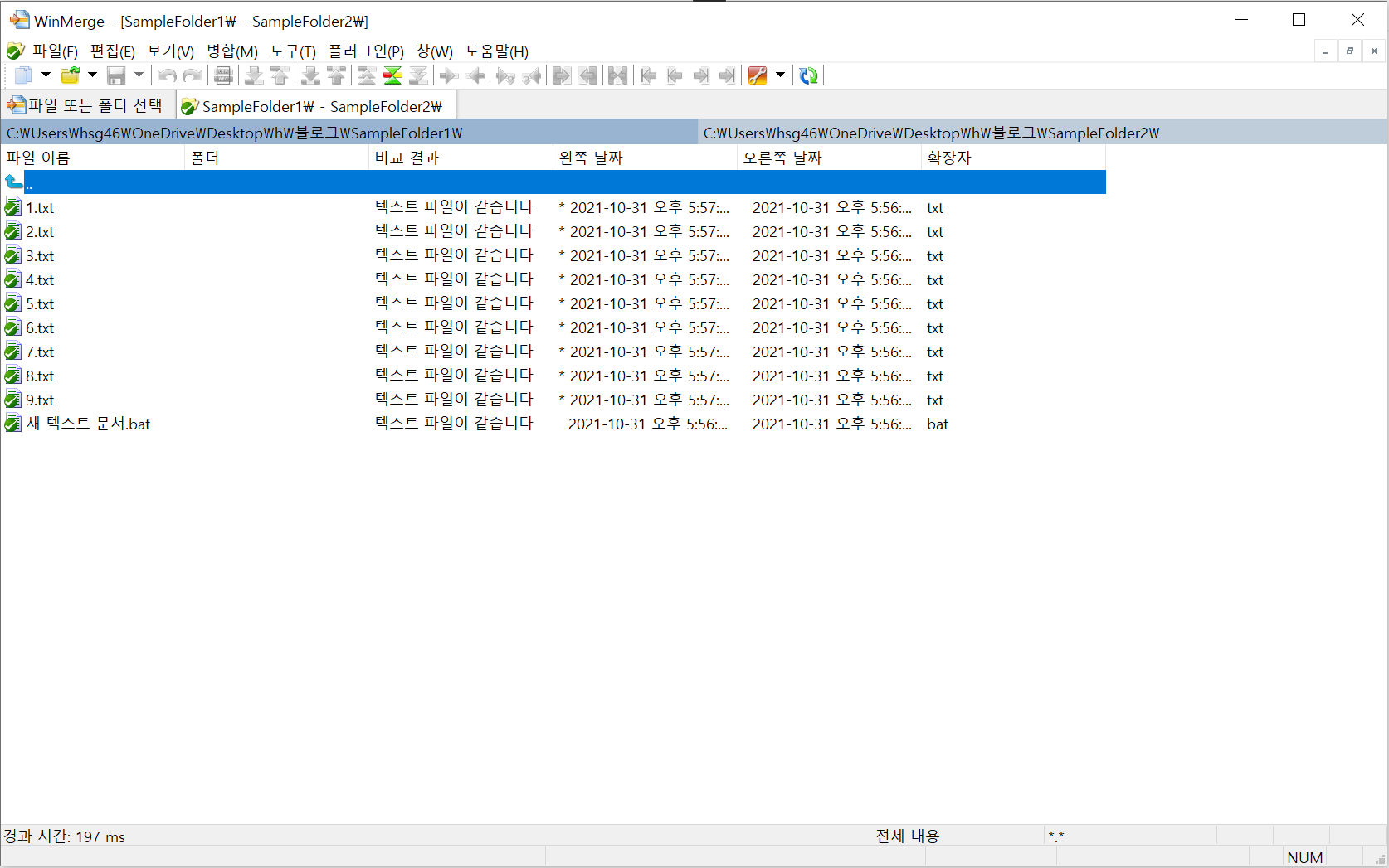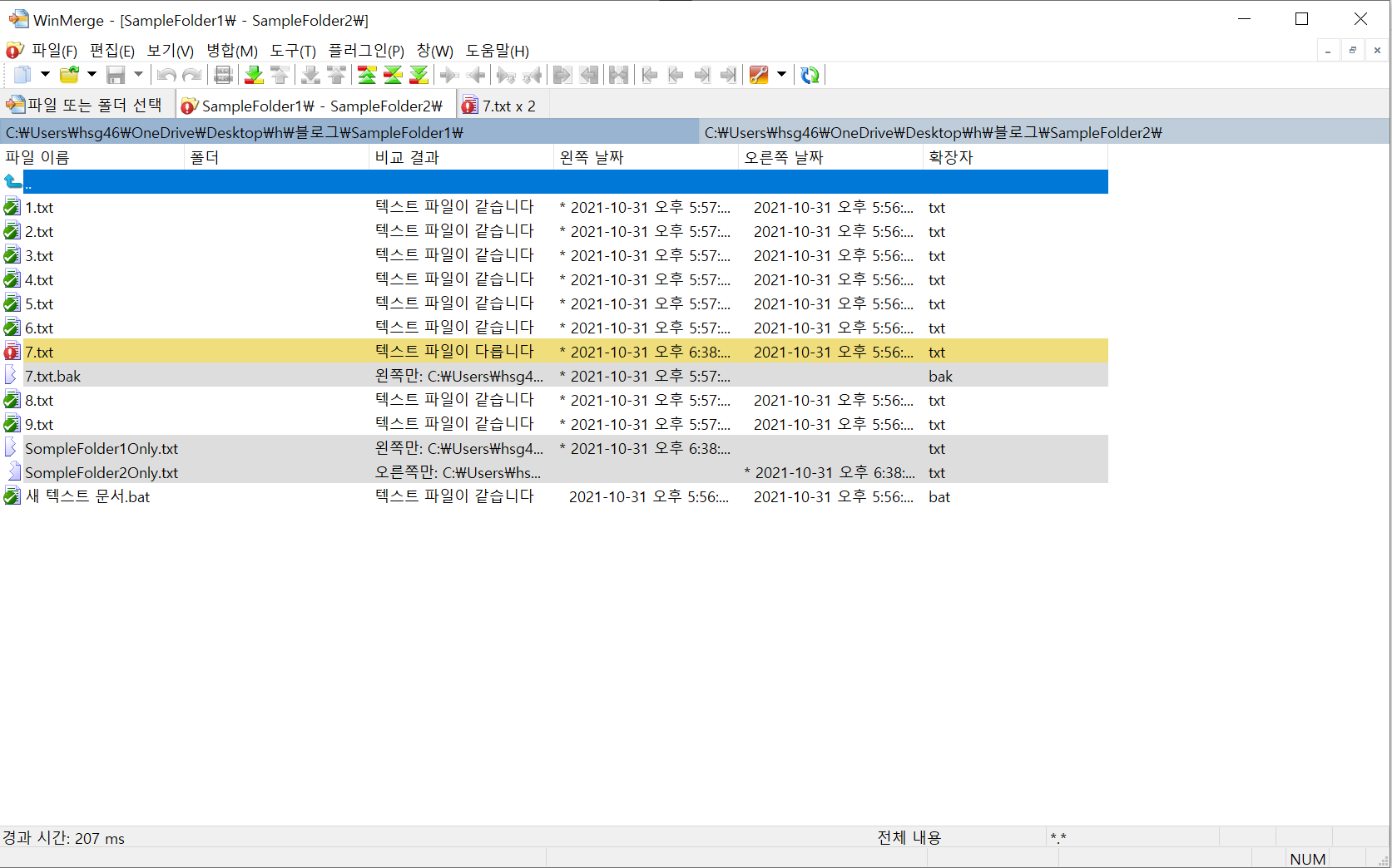 서로 교집합의 파일 내용 변경 뿐만이 아니라 SampleFolder1(왼쪽 경로) SampleFolder2(오른쪽 경로) 겹치지 않는 파일에 대한 내용도 한눈에 비교할 수 있도록 도와준다.