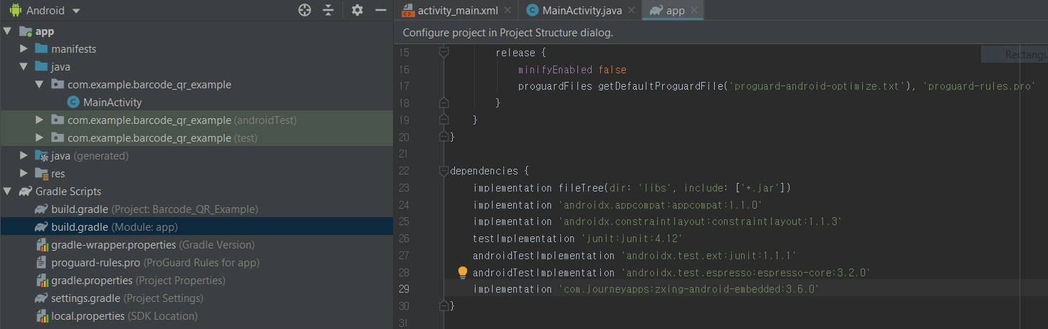- Android SDK 14이상을 지원하려면 zxing:core 3.3.0으로 다운그레이드